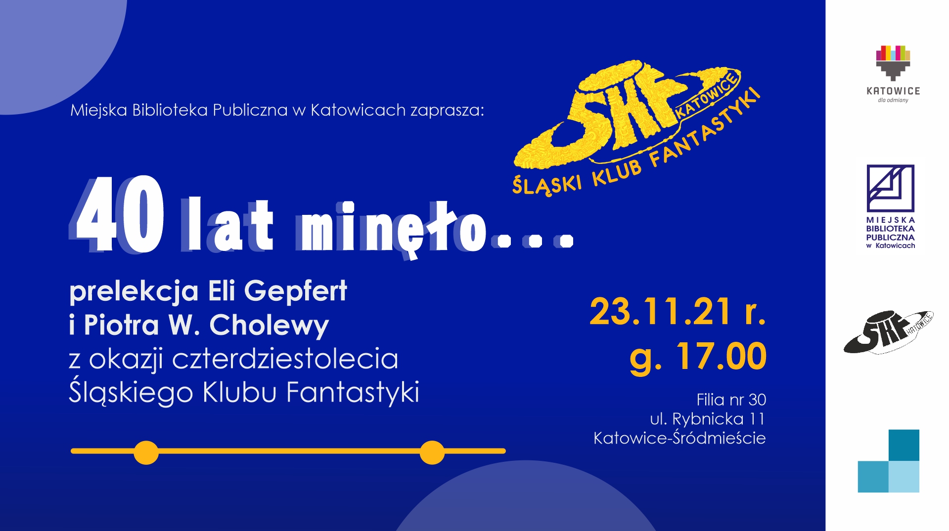 We wtorek 23 listopada 2021 roku o godzinie 17:00 w Filii nr 30 Miejskiej Biblioteki Publicznej w Katowicach rozpocznie się prelekcja Eli Gepfert i Piotra W. Cholewy z okazji czterdziestolecia Śląskiego Klubu Fantastyki.