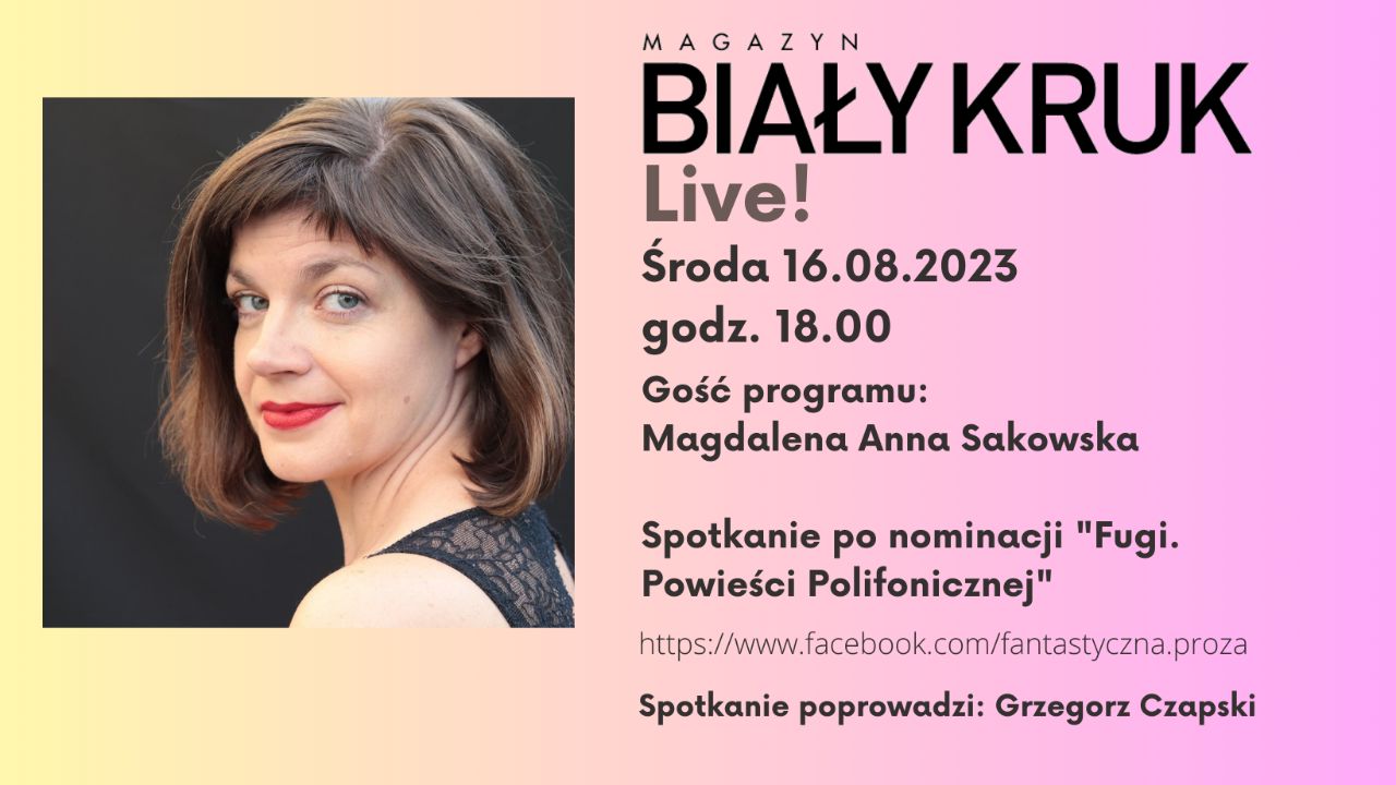 W środę 16 sierpnia 2023 roku o godzinie 18:00 rozpocznie się spotkanie z cyklu Biały Kruk Live! z serii Zajdlowej, którego gościnią będzie Magdalena Anna Sakowska.