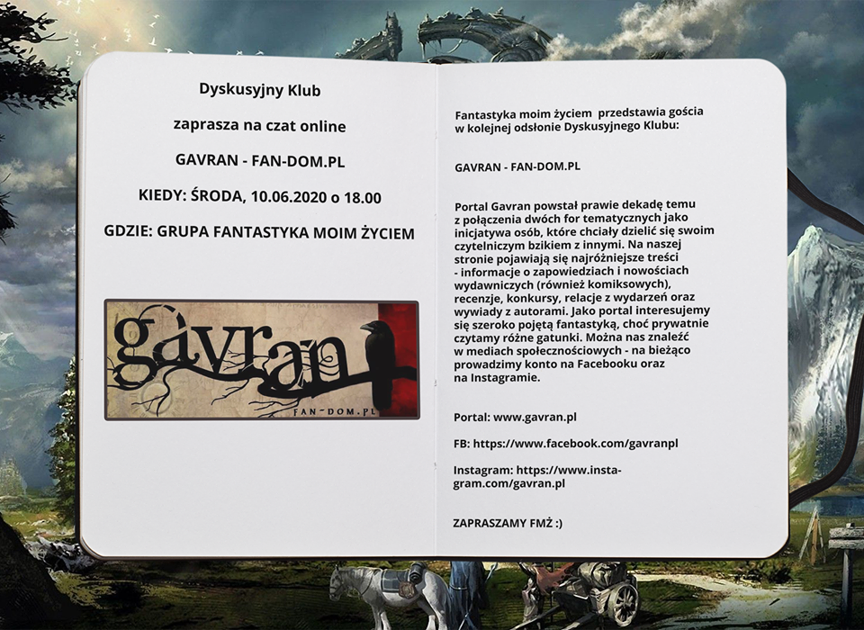 W najbliższą środę (10.06.2020 r.), o godzinie 18.00 gościem czatu w facebookowej grupie Fantastyka moim życiem – książki, filmy, seriale i nie tylko będzie Portal Gavran.