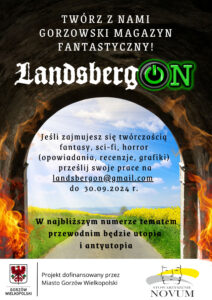 Gorzowscy fantaści mają szansę na publikację swoich prac w kolejnym, czternastym już numerze Gorzowskiego Magazynu Fantastycznego „LandsbergON”. Magazyn zawierać będzie opowiadania z gatunku science-fiction, fantasy i horror pisane przez gorzowskich twórców i nawiązujące do naszego miasta i okolic. Do magazynu w ramach „gościnnych występów” swoje prace mogą przesyłać również twórcy nie związani z Gorzowem (ale Gorzowianie będą mieli pierwszeństwo w naborze). Wszyscy, którzy zajmują się twórczością fantasy, s-f i horror (opowiadania, recenzje, felietony, grafiki) mogą przesyłać swoje prace na adres mailowy landsbergon@gmail.com do 30.09.2024 r.
