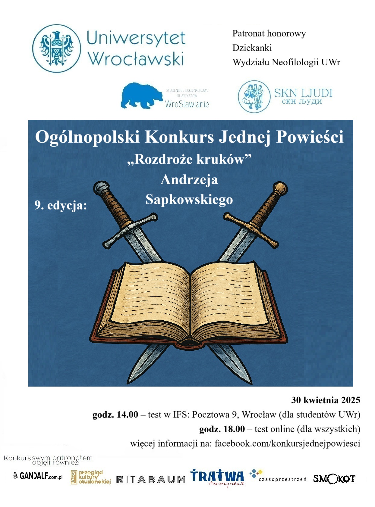 Studenckie Koło Naukowe Rusycystów WroSlawianie, Studenckie Koło Naukowe „Ljudi”, Zakład Literatury i Kultury Rosyjskiej IFS UWr oraz Zakład Praktycznej Nauki Języka Rosyjskiego IFS UWr zapraszają na IX Ogólnopolski Konkurs Jednej Powieści: Rozdroże kruków Andrzeja Sapkowskiego.
