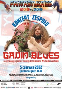 Zagłębiowska Mediateka w Sosnowcu, organizator wydarzenia „Fantastyka 2022: Wschód vs Zachód” zaprasza w niedzielę 5 czerwca 2022 o godz. 18.00 do Auli Zagłębiowskiej Mediateki przy ul. Kościelnej 11, na koncert zespołu Gaijin Blues – zacierającego granice między brzmieniami Wschodu i Zachodu. Wstęp wolny.