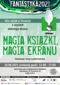 Zagłębiowska Mediateka w Sosnowcu, organizator projektu Fantastyka2021, serdecznie zaprasza w sobotę 18 września 2021 w godz. 11.00-17.00 do udziału w prowadzonej przez plastyka MBP w Sosnowcu – Alicję Ludwichowską – fotosesji z użyciem zielonego ekranu. Zdjęcia w niecodziennych, fantastycznych aranżacjach będzie można wykonać bezpłatnie w Sali Edukacyjnej Zagłębiowskiej Mediateki (ul. Kościelna 11).