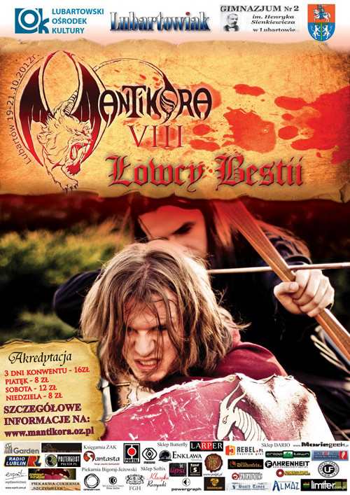 Już w piątek, 19 października, rusza lubartowski konwent fantastyki Mantikora VIII. Tym razem tematem przewodnim są Łowcy Bestii. Impreza potrwa do niedzieli. Organizatorzy przygotowali wiele konkursów, prelekcji i innych atrakcji. Nie może Cię tam zabraknąć!