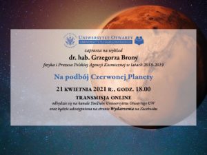 W środę 21 kwietnia 2021 roku o godzinie 18.00 w ramach zajęć Uniwersytetu Otwartego Uniwersytetu Warszawskiego rozpocznie się wykład dr. hab. Grzegorza Brony – fizyka i Prezesa Polskiej Agencji Kosmicznej w latach 2018-2019 – Na podbój Czerwonej Planety.