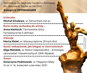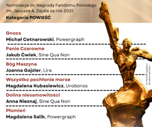 Dzisiaj (18.06.2022 r.) ogłoszono nominacje do Nagrody Fandomu Polskiego im. Janusza A. Zajdla za rok 2021.