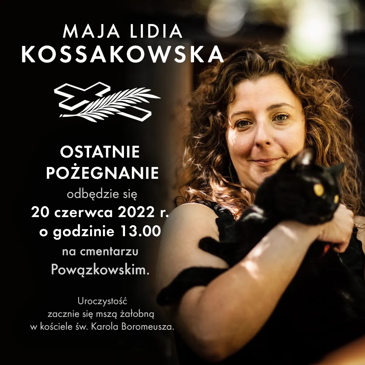 Pogrzeb mojej ukochanej Mai Lidii Kossakowskiej-Grzędowicz odbędzie się 20 czerwca o godzinie 13:00 na cmentarzu Powązkowskim. Zacznie się mszą żałobną w kościele Karola Boromeusza po której udamy się do rodzinnego grobowca. Jeśli będziecie mieć wolę by ją uhonorować, wpłaćcie datek na którąś z fundacji, które wspierała: Kocia Łapka, Ja paczę sercem, Centaurus. Wolałaby to od kwiatów.