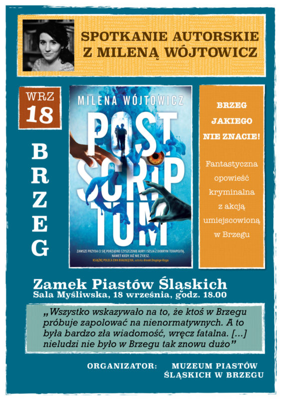 W dniu 18 września o godzinie 18.00, na Zamku Piastów Śląskich w Brzegu odbędzie się spotkanie autorskie Mileny Wójtowicz, autorki niedawno wznowionego cyklu „Wrota” oraz książek fantastycznych: „Post Scriptum”, „Podatek” i „Załatwiaczka”.