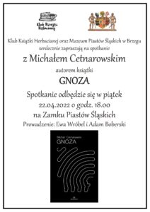 Muzeum Piastów Śląskich w Brzegu wraz z Klubem Książki Herbacianej zapraszają 22 kwietnia 2022 r. o godz. 18.00 do Zamku Piastów Śląskich na spotkanie autorskie z Michałem Cetnarowskim, pisarzem, publicystą, redaktorem Nowej Fantastyki, brzeżaninem, autorem nowo wydanej powieści pt. Gnoza.