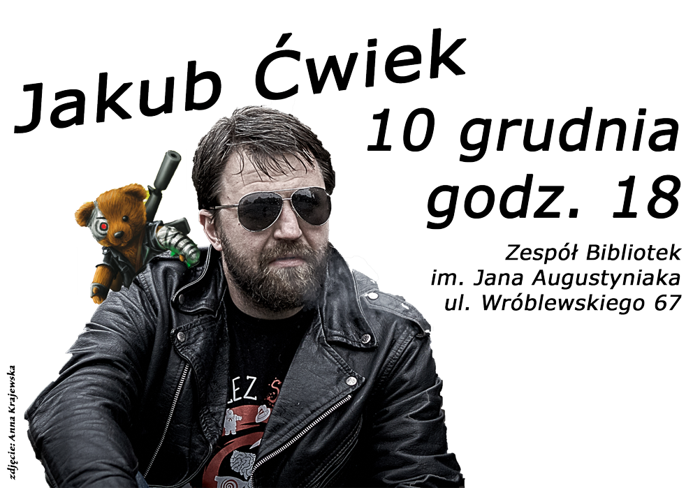 W czwartek 10 grudnia o godzinie 18.00 w Zespole Bibliotek im. Jana Augustyniaka, mieszącym się w Łodzi na ulicy Wróblewskiego 67, odbędzie się spotkanie z pisarzem Jakubem Ćwiekiem.