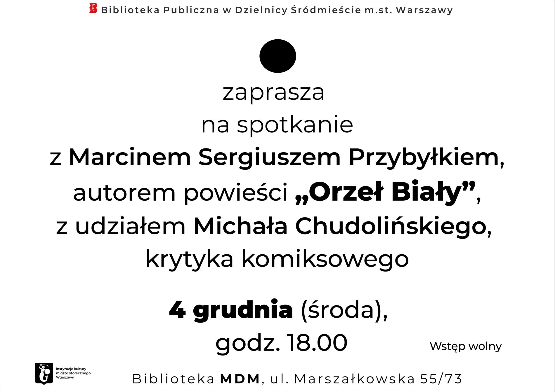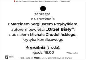 Zapraszamy 4 grudnia o godzinie 18:00 na spotkanie z Marcinem Sergiuszem Przybyłkiem, autorem powieści Orzeł Biały, z udziałem Michała Chudolińskiego, krytyka komiksowego. Spotkamy się w Wypożyczalni dla Dorosłych i Młodzieży Nr 7 z Oddziałem dla Dzieci (Biblioteka MDM) ul. Marszałkowska 55/73.