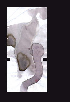 Po dwóch nieco bardziej mam wrażenie zrozumiałych pracach, pora na coś mocnego. Kolejne plamy, wykonane herbatą (owocową) a kto wie, czy nie kompotem. Na dodatek, na jakimś wydruku z bankomatu, czy czymś takim. Oprócz, być może nie tak oczywistych, wartości estetycznych, można się tu dopatrzeć podwójnie fallicznego węża - mężczyznę, patrzącego na coś w rodzaju omamu kobiety - bardzo trafne.
