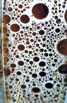 Następne zdjęcie jest kolejnym z serii kuchennej - jak widać jest to, uchwycony podczas krzepnięcia, tłuszcz (z kurczaka) w wodzie z detergentem. Można tu zobaczyć także wizję planet w kosmosie czy nawet coś o podłożu religijnym, ale ja raczej skupiłbym się na estetycznej stronie tego zdjęcia.