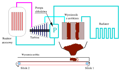 Na rysunku mamy bardzo uproszczony schemat proponowanego rozwiązania. Są to oczywiście najogólniejsze założenia, szkoda czasu na projektowanie technicznych szczegółów, gdy nie mamy podstawowych danych. Reaktor atomowy o umiarkowanej mocy stanowi źródło ciepła. Z niego rozgrzany nośnik biegnie rurami do turbiny. Nie musi to być turbina, ale wydaje się to najlepszym rozwiązaniem. Niskie ciśnienie na wylocie turbiny jest uzyskiwane dzięki chłodnicy działającej dzięki wyrzucanemu materiałowi i systemowi radiatorów. Tu drobna uwaga: w zależności od mocy reaktora, raz lepszym rozwiązaniem będzie umieszczenie jako pierwszego radiatora, a za nim chłodnicy innym razem na odwrót. Ochłodzony nośnik, który ma dzięki temu znacznie mniejszą objętość, pompa tłoczy na powrót do reaktora. Dla zwiększenia sprawności sama pompa także powinna być chłodzona, ale to energetyczne szczegóły, które są do rozpracowania w konkretnej konstrukcji. Tu chodzi o zasady.