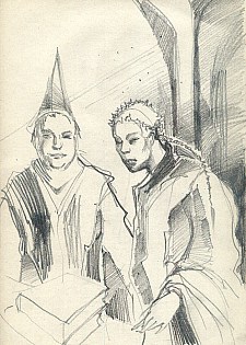 Przed domem na ławie siedział brzuchaty człowiek w średnim wieku i z błogą satysfakcją palił wyjątkowo długą fajkę, oparłszy ją o ziemię. Zwyczaj ten, zapożyczony od Nighaneerów, w ostatnich czasach rozpowszechnił się na pograniczu. Ciekawa sprawa, zważywszy, że ludzie prości na ogół nienawidzili Ciemnoskórych. Ale cóż - zbytnia bliskość granicy, zarówno południowej - tsajińskiej jak też wschodniej, bezustannie grożącej inwazjami Purpury zmienia obyczaje. Chociaż z drugiej strony ci wieśniacy tutaj nie wyglądali na żyjących w ciągłym zagrożeniu. Panujący w okolicy sielankowy spokój najpewniej można było zawdzięczać pobliskiej stanicy rycerzy Sol...