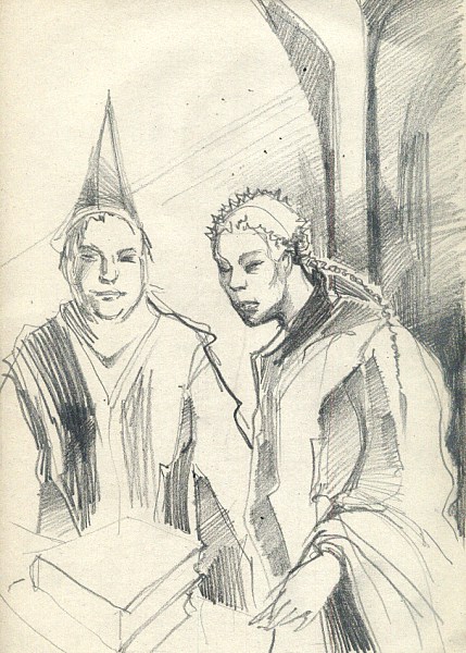 Czerwona, obfita szata o długich, wzorzystych rękawach oraz szeroki pas z wyhaftowanymi symbolami Gildii z całą pewnością wywierały odpowiednie wrażenie. Niestety, sprawiały również, że czarodziej myślał jedynie o zimnym piwie.