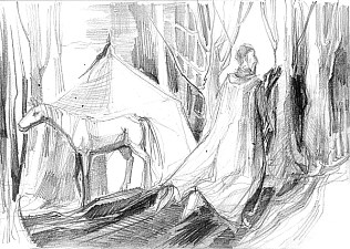 Nyjan wsłuchiwał się w odgłosy walki. Nadeszła najlepsza chwila, aby zbiec w las, byle dalej, ale wciąż pozostawał w namiocie, bo nie umiał odwrócić się i zostawić Sary - kobiety, która z kamienną twarzą szukała pośród śmiertelnych jęków głosu męża. Czuł też w sobie cierpienie rozłąki Kirkora, niespełnionej miłości, zdradzonej i domagającej się wybaczenia, lecz im dłużej odwlekał decyzję, tym bardziej narastał w nim strach, a Opiekunka wiła się przestraszona czymś, co nadchodziło, co nawet ją napawało przerażeniem.