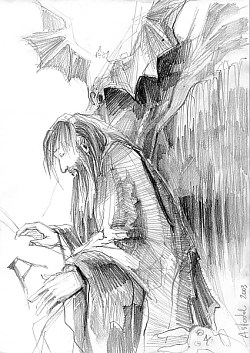 Odtąd każdej nocy mężczyzna słowami wyrzucał toczące go ból, strach, nienawiść. Wrzeszczał w ciemności, aż głosu mu brakło, aż zmęczenie brało górę i zasypiał snem niespokojnym, nie przynoszącym wypoczynku. I poranka każdego nad wezgłowiem barłogu znajdował kolejną nową literę wyrytą w skalnej caliźnie. Kto kuł w kamieniu te znaki? - zastanawiał się mężczyzna. Człek, czy raczej siła jakaś tajemna? I czy moc ta była czysta, czy też nie?
