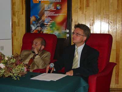 ![]() Prof Jan Klamut i Andrzj Drzewiński słuchają co mówi Lem.
