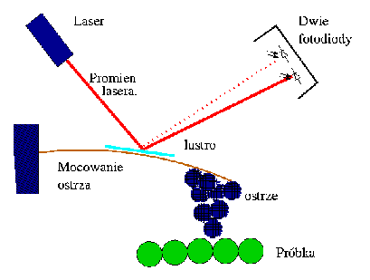 Gdy już jesteśmy przy technicznych szczegółach, to warto dodać, że STM – taki jest powszechnie używany akronim na skaningowy mikroskop tunelowy – działa na dwa różne sposoby. Jeden polega na utrzymywaniu stałej powierzchni skanowania, niezależnej od krzywizny próbki, drugi – znacznie częściej stosowany – na utrzymywaniu stałego natężenia prądu tunelowego podczas skanowania. W tym drugim modzie pracy ostrze jest przysuwane i oddalane w zależności od tego, czy trafi na górkę, czy na dolinkę. W uproszczeniu można powiedzieć, że ruchy ostrza odtwarzają geometryczny wygląd powierzchni. W skali atomowej nie jest to takie proste, ale na pierwszy rzut oka można powiedzieć, że rejestrując napięcie sterujące odległością ostrza od powierzchni, odtwarzamy jej realną topografię. W pierwszym trybie, nazywanym "ze stałą odległością", rejestrujemy zmiany prądu tunelowego. Niestety, jego zależność od odległości jest eksponencjalna – prąd bardzo silnie maleje, gdy odległość rośnie. Pomimo tego, że komputery znakomicie logarytmują, jest to już przeszkoda w odtworzeniu kształtu powierzchni. Trzeba sobie uzmysłowić na koniec, że w skali atomowej zaczyna odgrywać poważną rolę to, że nasze makroskopowe, statystyczne pojęcia, jak "powierzchnia", mają się nijak do tworu, który faktycznie obserwujemy – orbitali atomowych (bo atomy nie krążą po okrągłych czy eliptycznych orbitach, tak się tylko mówi w uproszczonym modelu Bohra). Oba typy pracy mają swoje wady i zalety i bywają stosowane oczywiście stosownie do tego, co chcemy uzyskać. Po zbudowaniu STM udało się zmajstrować jeszcze bardziej karkołomne i niemożliwe urządzenie – mikroskop siły atomowej, od nazwy angielskiej zwany AFM. Jego działanie polega na tym, że na elastycznej taśmie mocujemy ostrze i zbliżamy do badanej powierzchni. W pewnym momencie pierwszy atom ostrza zaczyna odczuwać działanie sił atomów powierzchni. To nieprawdopodobne, ale udaje się zarejestrować wyginanie się taśmy pod ich wpływem. Uzyskujemy to, świecąc na lusterko zamocowane na niej laserem i rejestrując ruchy plamki za pomocą dwu fotodiod umieszczonych tuż obok siebie. Zasadniczą zaletą AFM jest możliwość oglądania nieprzewodzących materiałów, takich jak na przykład mika. Jest ona zresztą dość typowym materiałem testowym, który łatwo uzyskać z czystą powierzchnią. Wystarczy zerwać za pomocą plastra kawałek kryształu. To, co na początku było wielkim zaskoczeniem dla starych doświadczalnych wyg, to fakt, że wszystkie te urządzenia mogą pracować w powietrzu. Dla STM odległość ostrze-próbka jest taka, jak średnia droga swobodna elektronu w powietrzu (owa "średnia droga swobodna" jest ścisłym terminem fizycznym, lecz znaczy to mniej więcej tyle samo, co potocznie przypisalibyśmy tym słowom). Jeszcze dziwniejsze jest to, że udaje się oglądać powierzchnie zanurzone w cieczach. Dzięki temu AFM budzi wielkie nadzieje w badaniach biologicznych.