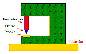 ![]() Pomysł na elektryczny schemat STM. ![]() Materiał piezoelektryczny (tu zaznaczony na niebiesko) pod wpływem przyłożonego pola elektrycznego kurczy się nieco lub wydłuża. ![]() Za pomocą trzech piezoelektrycznych belek możemy zbudować prosty mechanizm, który umożliwi ruch ostrza w trzech wymiarach. Pamiętajmy, że w tej skali belki się nieco wygną. ![]() Tak działa (w przesadzie) bimorf. ![]() Animacja przedstawia zasadę działania piezoelektrycznej "gąsienicy". By nie zaciemniać rysunku, nie narysowano zasilania układu. Strzałka wskazuje stopkę, która jest aktualnie przyciągana do podłoża przez pole elektryczne. ![]() Uproszczony schemat konstrukcji "psiego ogona". Kolorem niebieskim i pomarańczowym zaznaczono dwie warstwy piezoceramiczne. ![]() Tak może wyglądać mechaniczny schemat budowy STM bez uwzględnienia mechanizmu podsuwania próbki. Po prostu ostrze zamocowane nad próbką na "psim ogonie". Całość nie może leżeć bezpośrednio na stole, potrzebna jest jakaś izolacja przeciwwibracyjna, lecz może za nią posłużyć nawet ręka badacza. ![]() Zasada działania mikroskopu siły atomowej (AFM). ![]() ![]() ![]() ![]() Wyniki bardzo ważnych badań nad powierzchnią lateksu, z którego wyrabia się prezerwatywy. Ponieważ przeróżne ośrodki rozpuszczają pogłoski, jakoby przez ten materiał mogły przenikać plemniki, postanowiliśmy poszukać odpowiednich dziur. Dla informacji: rozmiar ludzkiego plemnika z ogonkiem to ok. 60 mikrometrów, rozmiar największego obszaru skanowania to 13,4x 13,4 mikrometra, więc plemniczek nie zmieści się w odpowiedniej skali na żadnym obrazku. Dziur, jak widać, nie znaleźliśmy. ![]() ![]() ![]() ![]() ![]() Próba obserwacji powierzchni miki w skali atomowej. Jak można się spodziewać, widzimy rzędy atomowe. Na rysunkach odtwarzających powierzchnię w trzech wymiarach możemy doszukać się równo poukładanych kupek, prawdopodobnie atomów. ![]() ![]() Tak wygląda jeden z bohaterów naszego opowiadania, mikroskop siły atomowej.