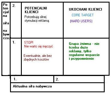 ![]() Siatka pokazuje, komu w targecie potrzebna jest reklama i jaka. Targeting jest łatwy, jak pociągnięcie za spust. Nasza głowa – to CORE TARGET lub HARD USERS, grupa z kwadratu 2-2. Oni już wierzą i kupują reklamowany produkt, a co więcej – sami go reklamują! To rzecznicy, ukochani klienci finalni każdego producenta – stać ich na zakup (wysoki potencjał nabywczy) i kupują (duża siła nabywcza) lojalnie. Nie potrzebują wiele reklamy – tyle tylko, aby ich upewnić, że dokonany wybór był najlepszym z możliwych. Niestety, to właśnie strzał w głowę, dobry, ale grupa jest zazwyczaj nieliczna, więc strzały do nich są drogie. Drugą ważną grupą są ci, którzy kupują, co prawda, niewiele, ale regularnie. Ich rynkowy potencjał jest niski – ale to oni są grupą najliczniejszą, znaczy wierzą w produkt, ale nie stać ich na zakupy w dużych ilościach i raczej więcej się już z nich nie wyciśnie. To klienci, którzy robią aktualną sprzedaż każdemu producentowi. Tutaj reklama też niewiele zdziała – oni już są przekonani. Dość liczna grupa – ale nie generująca wzrostu sprzedaży. Najmniej ważna grupa to ćwiartka 1-1. Dno! Nie chcą i nie kupują produktu, nie wierzą reklamie i nie stać ich. Znaczy – strzał w rękę, zupełnie nieopłacalny, pieniądze wyrzucone w błoto. Najważniejsza ze wszystkich to grupa z kwadratu 1-2. Stać ich na zakup i mogliby kupić reklamowany produkt, ale nie robią tego tak często, jakbyśmy chcieli. To najwyżej punktowany cel – korpus. Liczna grupa mogąca w przyszłości przynosić jeszcze większe zyski. To przede wszystkim dla nich robiona jest reklama. Pewny strzał, który przyniesie wzrost sprzedaży, o ile uda się dokonać zakończonego sukcesem programowania dysfunkcji mózgu. A od tego są profile psychograficzne, aby proces emulowania zakończył się pozytywnie... Oczywiście, psychograficzne profile lub statystyczne kalkulatory nie biorą się znikąd. Istnieje osobna gałąź swoistego "przemysłu" badawczego, który zajmuje się wyłącznie mapowaniem targetu. Wszystko można przebadać – od stosunków (TYCH stosunków), przez zwyczaje żywieniowe, częstotliwość odwiedzania lokali, czy rodzaj czytanej prasy... Stąd wiem, że 70% Polaków używa prezerwatywy, a stosunki uprawiają najczęściej w weekendy ze średnią częstotliwością 2 razy w tygodniu. Że najpopularniejszą potrawą jest kotlet schabowy. Że do kawiarni lub restauracji chodzi się średnio raz w miesiącu, głównie na piwo. Że najskuteczniejszą dla reklamy prasą jest kilka kolorowych magazynów kobiecych i że ok. 30% spośród czytających "Playboya" to... kobiety. Takich danych jest dużo więcej – inne do każdego produktu. Zawierają wszystko, co może być interesujące dla specjalistów od marketingu zlecających kampanię reklamową i dla samych realizatorów tej kampanii. Rynek badań rośnie – bo tylko badania mogą zmierzyć to, co dla reklamy najważniejsze: WAS. TARGET. Jeżeli w pamięci tłucze się melodyjka z reklamy, jeżeli automatycznie potraficie wymienić markę jakiegokolwiek z reklamowanych produktów, to możecie być pewni: JESTEŚCIE W TARGECIE. ZAWSZE.