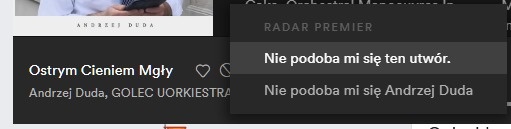 - Spotify zaskakująco i przewrotnie włączył się do przedwyborczej kampanii. Do tego serwisu trafiła pieśń patriotyczna wykonana przez Andrzeja Dudę w ramach #hot16challenge2. Na szczęście przeciwnicy (jeszcze) urzędującego Prezydenta otrzymali możliwość zamanifestowania swoich poglądów poprzez wybranie opcji „Nie podoba mi się ten utwór” lub „Nie podoba mi się Andrzej Duda”. [A.M.]