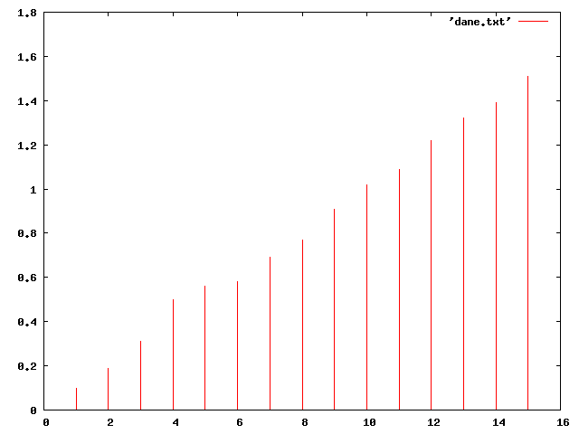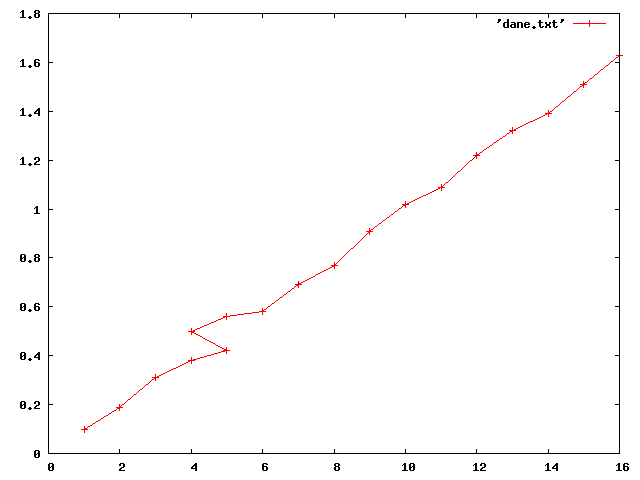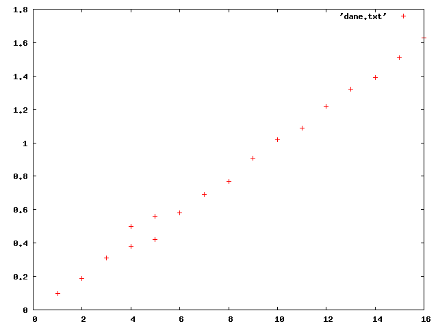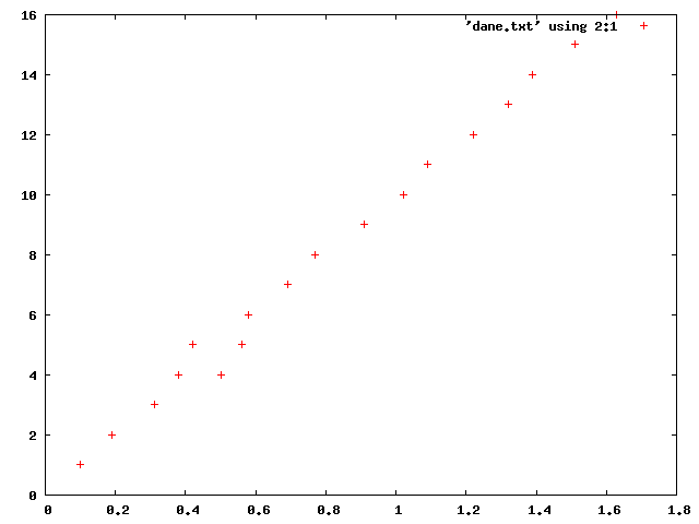 Dane zapiszemy w pliku „dane txt”. Sensowne przedstawienie wyników zależy od okoliczności. Najprościej jest uzyskać wykres złożony z samych punktów. Piszemy po prostu w wierszu poleceń programu: plot’dane.txt’.