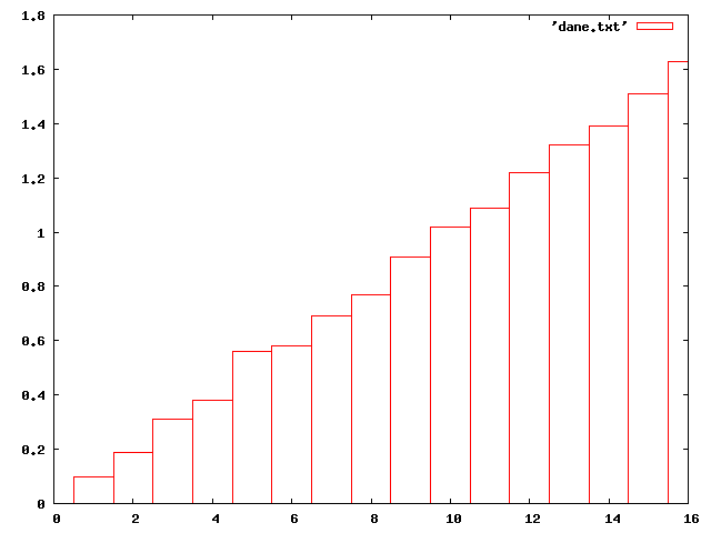 Program dokonał samodzielnie skalowania wykresu, bo domyślnie włączone jest autoskalowanie. Jeśli wykres wygląda dziwnie, możemy spróbować polecenia set autoscale. Wybrał też podziałkę dla skali oraz opisał linię wykresu w domyślny sposób za pomocą nazwy zbioru, jaki był wykreślany. Pamiętamy, że ten opis możemy zmienić dodając do polecenia plot’dane.txt’ polecenie title”moje dane”. Czyli wpiszemy: plot’dane.txt’ title”moje dane”.
