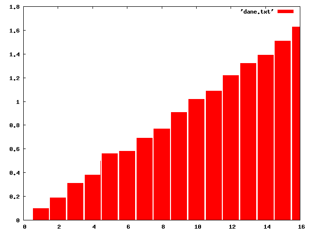 Uwaga, to zadziała, o ile dane będą porządnie zapisane w dwu kolumnach oddzielonych spacją. Jeśli w pliku będą trzy kolumny, a zechcemy wykonać wykres zależności kolumny 2 od 3, to nie wyjdzie. Program domyślnie traktuje kolumnę pierwszą jako współrzędną x, a drugą jak y. Jeśli chcielibyśmy to zmienić, musimy poinformować o tym program za pomocą polecenia using. Polecenie wykonania „odwrotnego” wykresu będzie wyglądało: plot’dane.txt’ using 2:1.