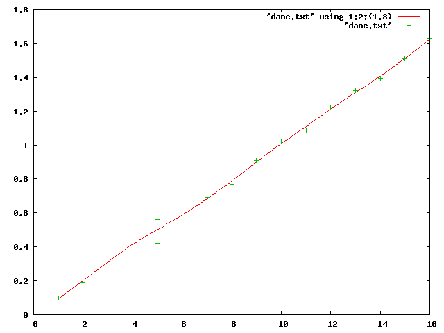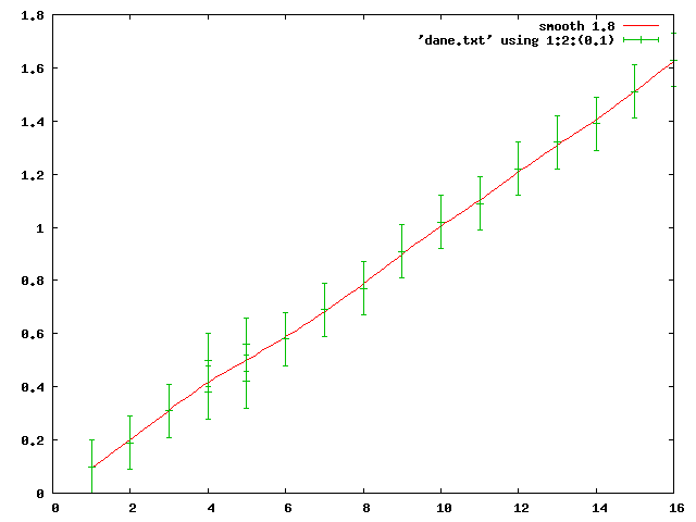 #plot 'dane.txt’ using 1:2:(1.8) smooth acspline title’smooth 1.8′,’dane.txt’ using 1:2:(0.1) with errorbars