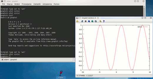 Okno terminala tekstowego oraz okno graficzne programu gnuplot.