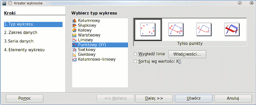 A więc wybieramy wykres „Punktowy XY”. Otwiera się więc okno „Wybierz typ wykresu” i zaznaczamy „Punktowy XY”.