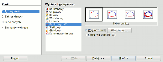 Chciałem Ci zwrócić uwagę tylko na jeden drobny szczegół. Mianowicie, aby powstał WYKRES, a nie „grafika biznesowa” w okienku, które ci się pojawi, możesz zaznaczyć tylko jedną opcję: „Punktowy XY”. Wszystkie inne służą do tworzenia grafiki. Czym różni się „wykres” od „obrazka”? Tym, że z wykresu możemy odczytać wartości. Wykres jest do tego, by przystawić do niego ekierkę i znaleźć odpowiadające sobie na wymalowanej linii oraz osiach punkty, którym da się z rozsądną dokładnością przypisać wartości. Dlatego np. zaawansowane funkcje programów do opracowania wyników w postaci „wykresów 3D” nie za bardzo służą do tworzenia wykresów.